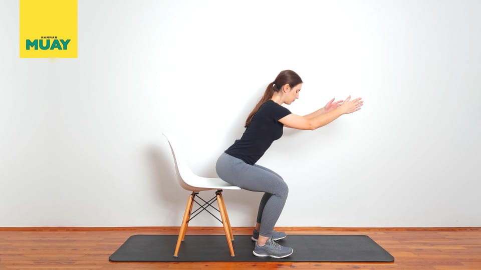 Stanite ispred čvrste stolice s nogama u širini ramena i spustite se kao da sjedate unatrag, držite prsa podignuta i koljena poravnata s nožnim prstima, lagano dodirnite stolicu bez sjedanja.